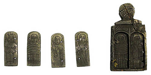 This rare Ethiopian Coptic icon features images of important saints carved into stone. Icons like this one, also known as prayer boxes, are used for devotional purposes, often as offerings on personal altars. Many Coptic Christians believe that the icons are filled with the spiritual presence of the saints, and prayers made to the icon are offered directly to the saints pictured.