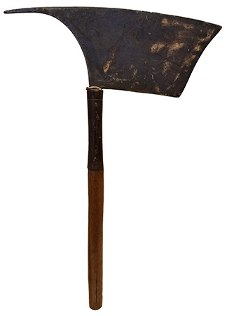 This early-20th century axe comes from the Bontoc people of the Philippines. The Bontoc live in the highlands of Luzon, the largest and most populous Philippine island. In the past, the Bontoc practiced headhunting, beheading their enemies during warfare and claiming the severed heads as trophies. Typically, a warrior would attempt to spear his opponent to deliver a mortal blow, but before he died, would decapitate the wounded man using an axe like this one. The trophy head was then brought back to the village where it was smoked, washed, and ritually activated to bring good fortune to the village. Sometimes, the lower jaw was removed to be used as a handle for ceremonial gongs. This Bontoc axe is currently on exhibit in the student-curated mini-exhibit Warfare and Violent Conflict, in which you can learn more about traditions linked to headhunting.