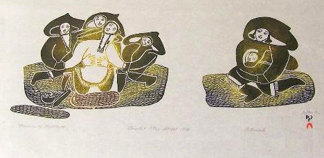 This 1976 framed lithograph by Canadian Inuit artist Pitseolak Ashoona is titled “Memories of Childbirth.” The print depicts a woman in labor supported by 3 other women on the left side and the woman post-labor holding her child on the right. Pitseolak (1904-1983) did not begin working as an artist until later in life as a way to support her family after relocating to Cape Dorset on Baffin Island following her husband’s death. Her artwork can also be found in the collection of the National Gallery of Canada.