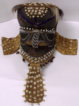 This Kuba mask, known as Mbwoom, is predominately made of carved wood with cowrie shell and bead embellishments. The Kuba people live in what is now the Democratic Republic of the Congo. Masks of this type are from the Kuba royal court, and are worn in dances during important festivities. The mask serves to send appeals to the ancestors. There are three main mythical characters represented in Kuba royal masks: Woot, the original Kuba king, Woot’s sister/wife, and a pygmy commoner who tried to lure the king’s wife away, symbolized by the Mbwoom mask.
