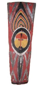 This palm spathe is from Saragum Village in the East Sepik River Province of Papua New Guinea. It features an image of a sitting male figure. Painted palm spathes of this type are used to decorate the front of a men’s house, also known as Haus Tambaran, a building where the men of the village negotiate with the spirit world to assure the villagers’ security and good fortune.