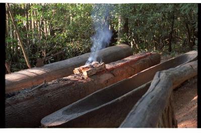 Southeastern Native Americans shaped their canoes by carefully burning and scraping large pine logs, as shown in these photographs from the MOA archives. Radiocarbon (C14) dating of the charred inner surface of our canoe piece indicates that it was made close to A.D. 970, more than one thousand years ago!