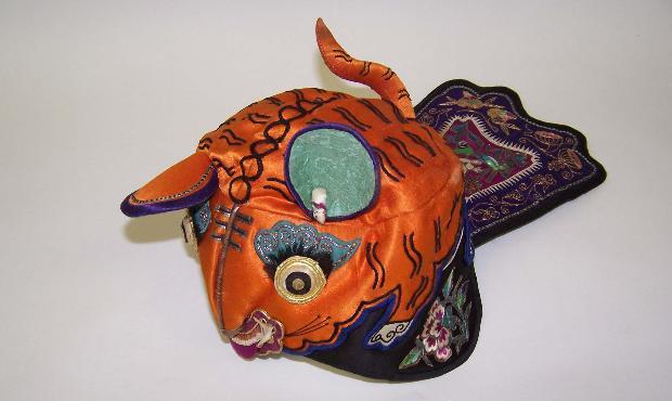 This silk hat in the shape of a tiger is representative of a traditional Q’ing Chinese form of head covering. The hat is designed to protect a male child from evil spirits that may wish to harm him.